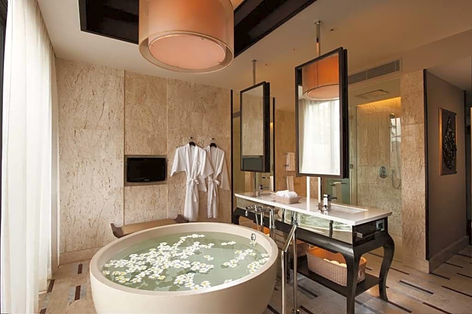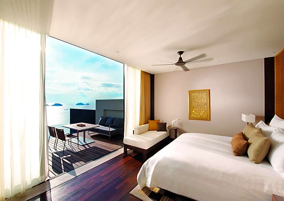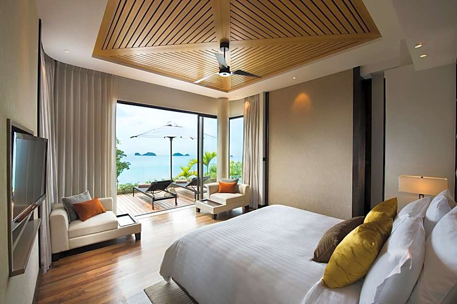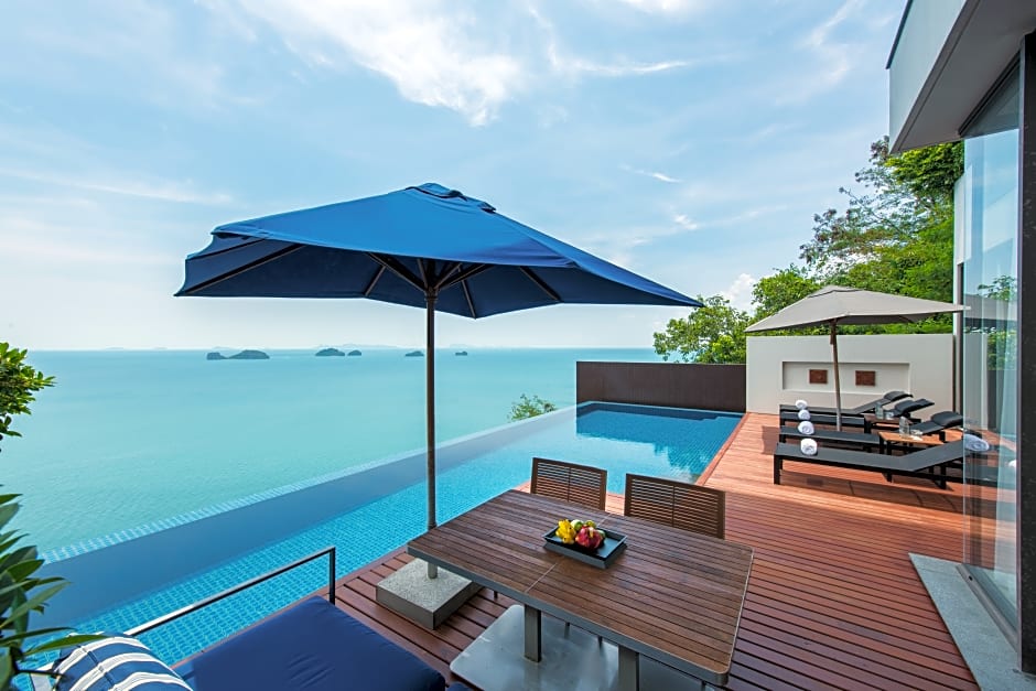 This villa has a balcony, sea view and mini-bar. Located on secluded areas in levels 2 and 3. Overlooking stunning views of the five islands. Offers a 10-yard long infinity pool and furnished terrace with sunbeds. It has a bathroom with an oversize bathtub, glass-walled rain shower, separate water closet and twin vanity sets.